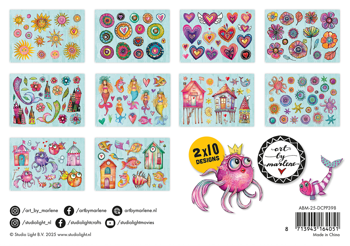 Studio Light Die Cut block bevat 20 vellen met allerlei gestanste elementen die aansluiten bij een collectie, maar ook op zichzelf gebruikt kunnen worden. Hierin vind je afbeeldingen die Marlene gemaakt heeft en je zo kunt uitdrukken. Ze kunnen onder andere gebruikt worden voor Scrapbooking, Mixed Media, Journaling en Kaarten maken. Daarnaast zitten er een aantal vellen collage papier in.